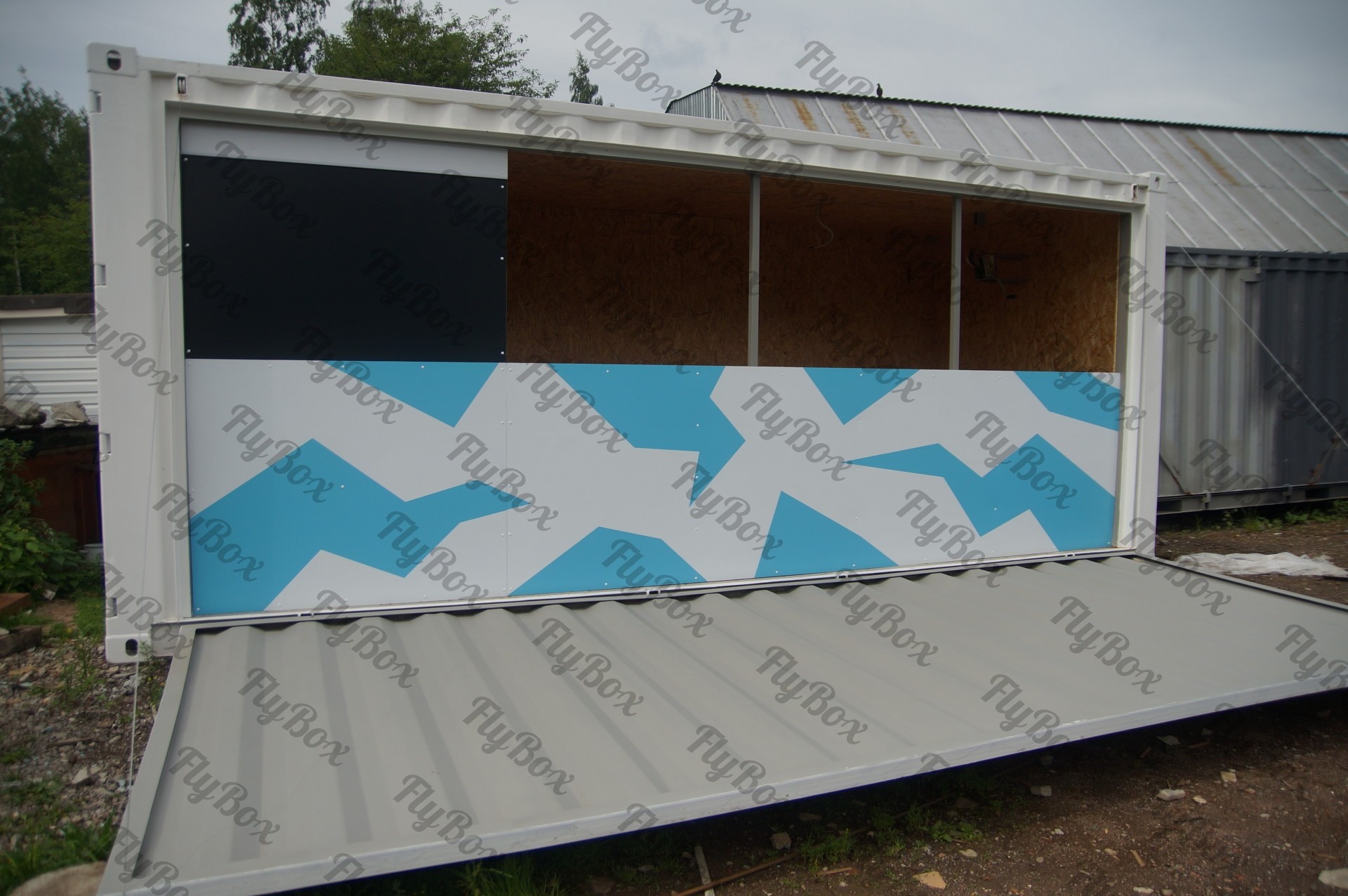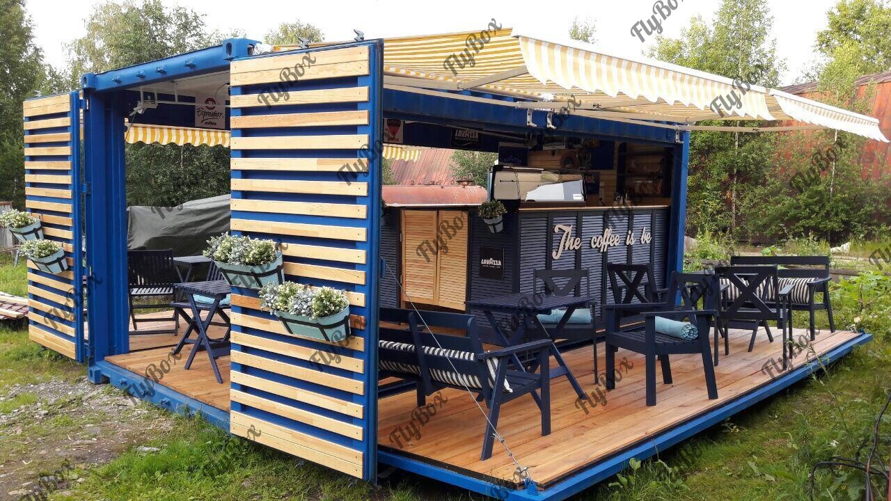 Мобильное кафе из морского контейнера FlyBoxCafe разворачивается для торговли за 12 минут.